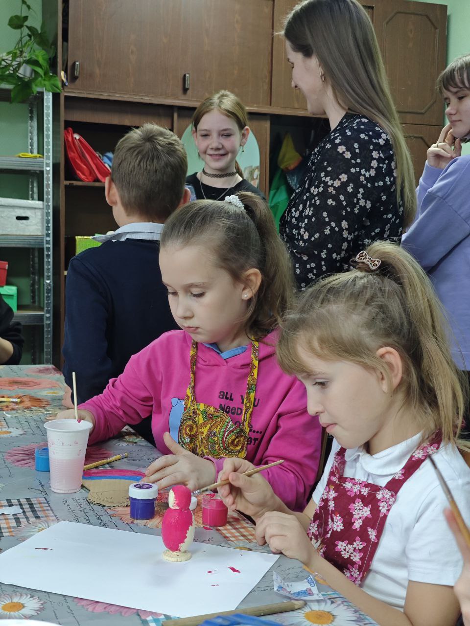 Гости побывали в мастерской, где их встречал педагог Денис Владимирович Аминников. Он познакомил гостей с работой станков, новым оборудованием, инструментами, ребята шлифовали вырезанные из фанеры детали игрушек. В кабинете ДПИ под руководством веселой Матрешки \ педагог Елена Юрьевна Зайцева \ все желающие разрисовывали деревянные поделки.